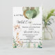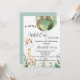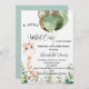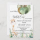Um fundo branco. Uma girafa de bebê e verde de eucalipto, samambaias e balões. Personalize e adicione o nome e os detalhes da festa. Texto: Um pouco selvagem está a caminho.