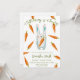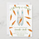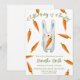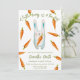 Convites de chá de bebê neutros em relação ao sexo. Com a frase 'UM COELHINHO A CAMINHO!', uma ilustração de um coelho (rabbit) em aquarela com cenoura nas patas, e muitas cenouras na cor laranja. Itens correspondentes disponíveis.