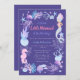 Convite de chuveiro de bebê menina com sereiazinha roxa debaixo do mar em aquarela. Design feminino que você pode personalizar com seu nome e texto para um chuveiro de bebê menina.
