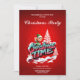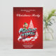 Um elfo animado de desenho animado com roupas verdes e orelhas pontiagudas ondas de uma paisagem nevada. As palavras "Horário de Natal" são escritas em letras grandes, coloridas, em estilo de grafite, com um esquema de cor rosa e azul. O fundo é vermelho vivo, sugerindo uma atmosfera festiva de férias. Os flocos de neve caem suavemente, adicionando ao toque de inverno.