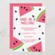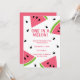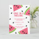 Um em um convite de aniversário Melon, embora o texto possa ser alterado para qualquer ano de aniversário ou chá de fraldas. Imagem brilhante, cor-de-rosa claro e de melancia verde, com embelezamentos de sementes de melancia.
