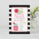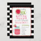 Tema do primeiro aniversário da melancia com a frase "um num melão" com fatia de melancia incorporada em design. Borda é pom inspirado. O fundo é uma faixa branca e preta. Mason jar melancia bebe no fundo.
