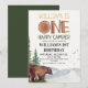 Floresta encantadora e única, urso - um feliz campista - convite de 1º aniversário.