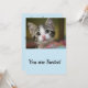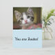 Um convite, estilo flat com um gatinho malhado de olhos verdes, com um fundo desfocado