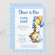 Um convite de festas de gingham azul-pato sortudo, primeiro aniversario digital instantâneo de modelo, pato-real fofo com chapéu de festa e balões com borda azul-pastel e macia de gingham para convite de festas de primeiro aniversario para rapazes