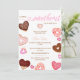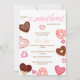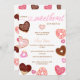 Um pouco de amor está a caminho, um chá de fraldas de rosquinhas namorados amorosas com ilustração adorável e original de rosquinhas em forma de coração em um padrão de sobremesa cor-de-rosa e chocolate com uma tipografia de escrita de pincel em forma de letra cardíaca.