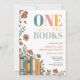 Este convite para o primeiro aniversario apresenta livros, flores e "um para os livros" para convidar amigos e familiares a celebrarem o seu pequeno.
