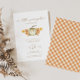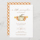 Nossa design de abóbora de cor d'água inspirada no outono apresenta adoráveis padrões de gingham laranja xadrez, folhas de outono e uma abóbora branca. Celebre seu bebê que vai cair com seus amigos e entes queridos com nosso design de chá de fraldas mínimo e elegante.