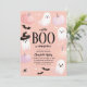 Um pequeno Boo está quase a chegar! Convite para Chás de fraldas do Halloween com fantasmas bonitinhos desenhados pela mão, abóboras, morcegos, aranhas e teias de esfregão em laranja pastel, pinks e roças. O convite perfeito para o seu Chá de fraldas temático de Halloween!
