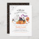 Cartões de modelo de convite para chás de fraldas do Dia das Bruxas. A frente deste design apresenta uma teia de aranha no canto superior esquerdo. O texto diz "um pouco de bu está quase vencido!" com uma ilustração de amigos loucos pintados à mão. Um adorável gato preto está se debruçando sobre uma abóbora com um chapéu roxo e varinha mágica, há dois fantasmas, um chapéu feiticeiro, um morcego roxo, um balão laranja, e doces! Abaixo, seu nome e detalhes do evento de chá de fraldas aparecem na tipografia moderna com o nome da futura mãe em laranja, e a data de chá em roxo. Estas cartas invertem para um padrão colorido de confete branco e laranja contra um fundo preto. Uma design neutra em termos de gênero, perfeita para qualquer rapaz ou rapariga que se esperava no outono ou no início do inverno. Clique em "Personalizar" para alterar o texto. Sinta-se à vontade para me contactar com quaisquer perguntas relacionadas a design!