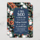 Cute Um pequeno boo é quase devido ao convite para o chá de fraldas de Halloween com um quadro assustador de Halloween com abóboras, gatos, fantasmas, crânios, ferramentas, morcegos, morcegos e folhas de outono sobre um fundo azul escuro.