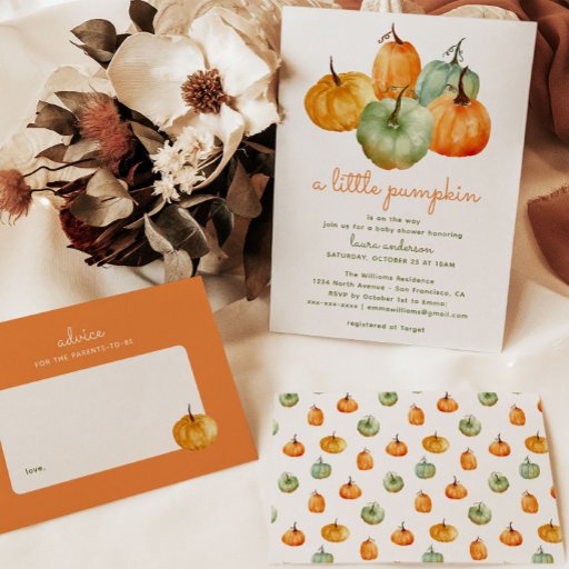 Esta design faz parte da coleção de chás de fraldas "A Little Pumpkin". Apresenta papelaria bonitinha com ilustrações de abóbora de outono com cor d'água em tons de outono, como laranja, terracota, verde-sábio e marrom. Perfeito para as comemorações de outubro e chá de fraldas de novembro.