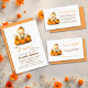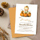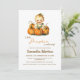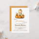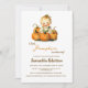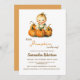 Elegante convite de chá de fraldas simples que apresenta um desenho de aquarela de um bebê sorridente giro rodeado por belas abóboras e cobertura de laranja macia pastel de outono sólido.