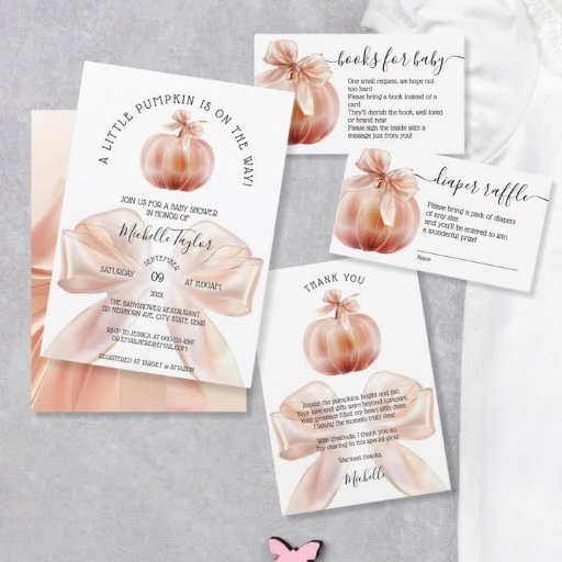 Um pequeno Chá de fraldas de outono de outono de Bombas Brancas para a época do outono, um convite para a mãe ser um chá de fraldas neutro em termos de gênero, com abóbora de aquarela e verde com detalhes sobre o ouro