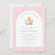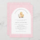 Um Pequeno Duckling está no Caminho do Chá de fraldas - apresentando um pequeno pato bebê sentado em verde e flores. O convite está rodeado de adorável gingham cor-de-rosa pincelado com tipografia moderna para um sentimento minimalista. O convite faz parte de uma Coleção de Chás de fraldas.