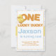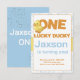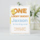 Um convite de aniversário do primeiro aniversário do Pato Sortudo, um convite de aniversário com um pato fofo e bolhas flutuantes. Sorte um convite de aniversário sem foto.
