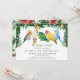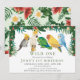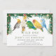 Celebre seu pequeno selvagem completando um ano com este convite de aniversário caprichoso de tema tropical. O design apresenta um grupo de adoráveis papagaios exóticos e flores de greenery tropical em aquarela com folhas.