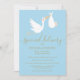 Apresentando um carregando de cegonha fofo uma entrega muito especial, em um fundo azul macio, este chá de fraldas, borrifo ou casal é perfeito para todos os pequenos que estão a caminho. Adicione seus detalhes de celebração em texto dourado para criar o convite perfeito. Projetado por Thisnotme©