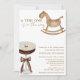 Um convite para o Chá de fraldas Espresso Martini - Um convite para o chá de fraldas único e adorável com um espresso martini adornado com um arco de coquetes marrom mocha e um brinquedo de cavalo de balanço de madeira de pintura, ambas ilustrações de aquarela. Fonte de script elegante e manuscrita ao lado da fonte de bloco elegante em tom castanho. Edite este modelo de convite de chá de fraldas com seus próprios detalhes de evento. Perfeito para primavera, verão ou chás de fraldas de outono. Para pais ou mães procurarem por algo diferente e de um tipo. Disponível no impressão e no download digital, perfeito para envio via texto, email ou mídia social.