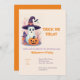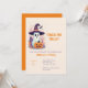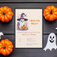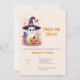 Trick ou trata? Adorável design de festas de Halloween com um fantasma adorável com um chapéu de bruxa e uma abóbora esculpida. Edite este convite para o seu próprio evento de diversão, pode também transferir o convite e o texto para os seus amigos e familiares.