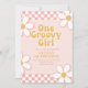 Convite de primeiro aniversário da Uma Garota Groovy inspirado no Retrô com fontes estilo anos 70 e dálias e padrão xadrez.
