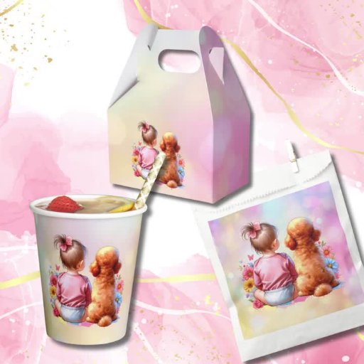 Convites de banho para bebês. Uma menina doce sentada ao lado de um Poodle Apricot em um pedaço de flores bonito de aquarela. As cores utilizadas são cor-de-rosa, coral, roxo, azul e amarelo.