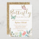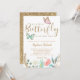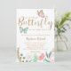 Cartão modelo de convite para chá de fraldas de doce, com borboletas cor-de-rosa e de menta, com embelezamentos dourados falsos. O texto no topo diz "Uma borboleta pequena está a caminho". Há flores no fundo. Personalize este produto adicionando as informações da sua parte.