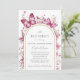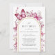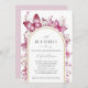 Um convite de chá de fraldas com borboletas, flores e um arco de ouro.