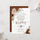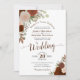 Este convite de casamento lindo apresenta rosas em aquarela em tons de laranja enferrujado, umber queimado e coral pêssego. O buquê elegante inclui raminhos de lavanda, eucalipto, gipsófila e outras folhas e folhagens em um fundo branco clássico. A redação é projetada para listar os nomes dos anfitriões no topo. Perfeito para uma cerimônia de outono.