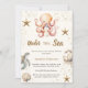 Celebrate your little mermaid on the way with this adorable Under the Sea baby shower invitation, featuring a sweet watercolor octopus holding a baby bottle surrounded by seashells, starfish, and bubbles.