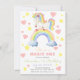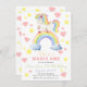 Este adorável design apresenta um unicórnio com um arco-íris de cor pastel. Corações e estrelas. Arco-íris em céus.