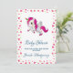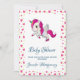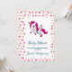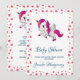Convite para chá de bebê com um unicórnio alado branco com crina rosa, cauda e cascos. O chifre tem anéis de cor de arco-íris e parece um pirulito de doce. Este adorável unicórnio está empinado nas patas traseiras. Coração rosa doce na bochecha. O fundo é um padrão de corações rosa e verde. Todos os detalhes da festa estão no verso.