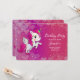 Convite de aniversário com um unicórnio alado branco com crina rosa, cauda e cascos. O chifre tem anéis de cor de arco-íris e parece um pirulito de doce. Este adorável unicórnio está empinado nas patas traseiras. Doce coração rosa na bochecha. O fundo é um padrão sonhador de corações e estrelas. Todos os detalhes da festa estão no verso.