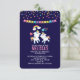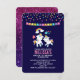 Um convite de aniversário brilhante e feminino. Projetado com 2 unicórnios bonitos com caudas brilhantes e coloridas, e homem. Um arco-íris colorido com nuvens em cada lado acima de suas cabeças. Outros elementos incluem uma pequena flor, um coração e algumas estrelas. No topo estão pontos de confete vibrantes coloridos. Apenas uma imagem não um confete real. Um banner de bunting se estende pela parte superior. Um fundo roxo escuro.