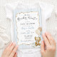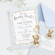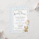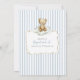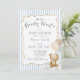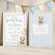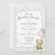 Convite de chá de bebê personalizado com tema de ursinho fofo em azul claro empoeirado neutro e branco + bege "We Can Bearly Wait!" apresentando um adorável ursinho de água-forte segurando balões xadrez e uma moldura de laço bege desenhada à mão sobre listras azuis na frente e verso. É a maneira mais fofa de convidar os convidados a presentear a nova mamãe com amor! Adicione facilmente sua própria mensagem para torná-lo único (você pode até carregar um código QR do registro no verso!) e encomende impressões + envelopes, ou baixe o arquivo digital imprimível e imprima em casa! Encontre o cartão de rifa de fraldas, cartão de livros para bebê, forro de envelope, decoração e papelaria correspondente na coleção completa acima ♥ Solicitações de design personalizado, adições de cores, coleção de produtos e perguntas sobre modelos são sempre bem-vindas - clique no botão "mensagem" ou envie um e-mail direto (com tempo de resposta rápido!): contact@figandlilyco.com. O design é criado com carinho
