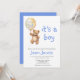 Celebre com estilo com este adorável convite de chá de bebê que apresenta um ursinho fofo flutuando com um balão dourado. O texto azul divertido anuncia "é um menino", enquanto o balão fornece espaço para destacar a data e hora do seu chá. Este design alegre combina charme caprichoso com detalhes práticos, incluindo o convidado de honra, local, RSVP e informações do registro, tornando-o perfeito para chás de bebê alegres ou festas de revelação de gênero. Os tons de estilo aquarela quente e a ilustração do ursinho doce estabelecem um tom feliz para dar as boas-vindas ao seu pequeno.
