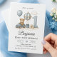 Celebre o seu pequeno completando UM ano com este urso de pelúcia azul e design de "primeiro aniversário ursinho" de balão de ar quente. Um doce urso de pelúcia em aquarela andando de carro de brinquedo senta-se sob um balão de ar quente listrado, nuvens suaves, blocos de madeira e um grande número 1—perfeito para um convite de primeiro aniversário de menino em um estilo moderno e neutro de berçário. A paleta de azul pastel suave e cinza mantém a aparência atemporal para fotos e lembranças.