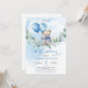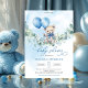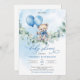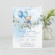 Design de encantador para os convites para o Baby Shower apresenta um lindo ursinho azul de aquarela e castanho com assento de balões sobre o balanço do eucalipto. Tipografia de desenho em mão moderna. Não hesite em contactar-me para obter itens ou personalizações correspondentes. Rosas de cor Bebê ©