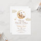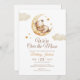 Sobre a Lua Gênero Neutro Chá de fraldas Invitation apresenta uma ilustração fofa de um ursinho de pelúcia descansado sobre uma lua amarela, com um tratamento elegante de escrita. Personalize-o com os detalhes do evento. Um belo convite, perfeito para o seu evento!