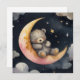 Uma encantadora peça em aquarela que mostra um urso sonolento aninhado em uma lua crescente brilhante, cercado por nuvens suaves e estrelas. Este design encantador é perfeito para arte de parede de berçário, decoração temática de hora de dormir ou como um presente para jovens sonhadores. Traga a magia do céu noturno para sua casa com esta obra de arte calmante.