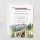 Ilustração de aquarela adorável de um urso-mãe grizzly seguido pelo seu filhote. Uma bela pintura aquosa de montanhas, paisagem florestal com árvores elegantes e verdes decoram o fundo deste convite para chás de fraldas neutro em gênero. Tema do chá de fraldas russo da floresta. Que comece a aventura!