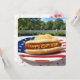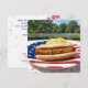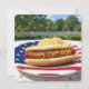 A hot dog adorned with the message 'Happy 250th, USA' rests on a patriotic plate alongside potato chips, all set against a star-spangled cloth with a charming garden backdrop.