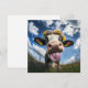 Uma imagem lúdica e aproximada de uma vaca em um prado ensolarado, adornada com uma coroa floral vibrante feita de margaridas e flores silvestres. A vaca põe a língua para fora, acrescentando um toque de humor e charme à cena. O céu azul brilhante e as nuvens suaves no fundo aumentam ainda mais a alegria e caprichosa sensação da imagem.