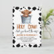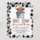 Vaca Highland In Balde Cow primeiro aniversario Invitation With QR Code Cute holy cou O convite de aniversário para um garotinho que apresenta uma vaca bonita da Highland em um balde e um padrão de impressão de vaca negra no limite do convite. Este convite para o aniversário de vacas da Highland pode ser usado para qualquer idade e contém um código QR substituível no verso.