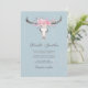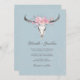 Envie sua família e amigos... este trendy Boho inspirou um convite de casamento rústico personalizado. Este modelo de design apresenta um crânio de vaca desenhado manualmente com um vestido cor-de-rosa pincelado de cabeça floral de rosas delicadas sobre um fundo de cinza azul de madeira intacta. Personalize seus detalhes de casamento em um roteiro elegante. A parte traseira da placa também tem uma textura falsa de madeira para combinar. Os melhores votos para o seu casamento. Desenhada pela artista Susan Coffey.