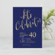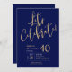 Este fabuloso convite de festas de aniversário de 40 anos azul-marinho, que diz "Celebrado de Vamos!" numa letra moderna em ouro seria perfeito para celebrar o homem na aniversário de 40 anos da sua vida. Este convite é moderno, na moda, moderno e contemporâneo. Para ver seus convites personalizados, selecione "Personalizar este modelo" e digite suas informações. É super fácil!