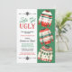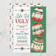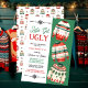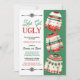 O Convite de festas de Natal "Vamos Feio" apresenta um trio de suéteres de Natal feios na frente sobre um fundo verde retrô no lado direito. O lado esquerdo apresenta os detalhes de sua celebração em vermelho, branco e preto com gráficos de divisor de neve preto no topo e na parte inferior — tudo em um fundo branco. As costas mostram um padrão repetido de suéteres feios de férias e sagrados e bagas em fundo branco. Os suéteres ostentam uma variedade de designs festivos e peculiares, capturando o espírito divertido e excêntrico da época de férias. A legenda do convite, "Vamos fica tonto", é exibida em frente com um casal de fontes atraentes. Este design de retrô divertido agradará aos seus destinatários! Design composto por Designs Holiday Hearts.