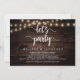 Vamos celebrar a festa, Cartão de Convite / Anúncio de Casamento Rústico, com design de Madeira e Luzinhas. Perfeito para a sua recepção de casamento e festa pós-casamento. Adicione seus detalhes na fonte correspondente.
