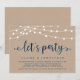 Lindas Luzes de Corda de Fazenda Rústica Moderna, fonte de letra em azul marinho em fundo de papel kraft, Anúncio de Fuga para o Casamento, cartão de convite (Vamos Festejar). Isto é perfeito para o seu reception de casamento e festa de celebração pós-casamento. Adicione seus detalhes na fonte / letra correspondente.