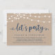 Lindas Luzes de Corda de Fazenda Rústica Moderna e Bonita, fonte de letra cursiva azul-marinho em fundo de papel kraft, Anúncio de Fuga para Casamento, cartão de convite (Vamos Festejar). Isto é perfeito para a recepção do seu casamento e festa de celebração pós-casamento. Adicione seus detalhes na fonte / letra correspondente.